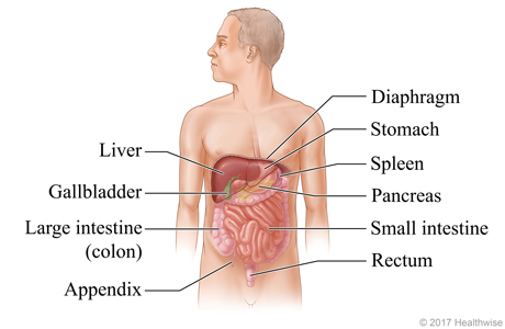 Abdomen (Belly)The major organs in the abdomen (belly) include the liver, gallbladder, large intestine (colon), stomach, spleen, pancreas, small intestine, and rectum. The diaphragm separates the abdominal cavity from the chest cavity. The appendix is also found in the abdomen. It's attached to the large intestine. ByHealthwise Staff Primary Medical ReviewerAdam Husney, MD - Family Medicine Specialist Medical ReviewerE. Gregory Thompson, MD - Internal Medicine Current as ofJuly 14, 2017 Current as of: