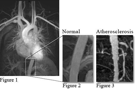 MRA of a narrowed and abnormal aorta from the buildup of calcium and fat (cholesterol)